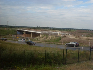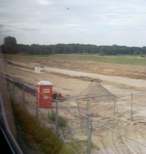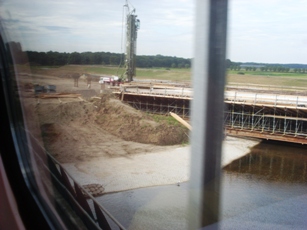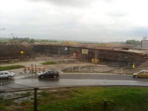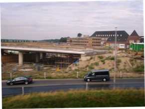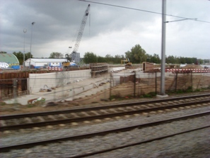 Foto's uit de trein genomen op kunstwerken rondom Drongelens kanaal en Randweg. -Links: het al gereedgekomen viaduct onder het spoor Tilburg/Eindhoven. De toeleidende wegen worden nog aangelegd. -Boven de weg die met een viaduct over het kanaal naar de Oude Vlijmenseweg loopt. Op de achtergrond het Koning Willem 1-College. -Links boven: dezelfde situatie met het viaduct met de brug over de Oude Vlijmenseweg richting Paralleleweg /Magistratenlaan. foto's © paul kriele, 13 mei 2010. |