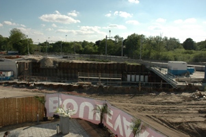 | Foto's genomen vanaf het nieuwe Denkstation aan de Bosscheweg op de grens met de Vughterweg. -Boven: De tijdelijke omleidig voor het verkeer Den Bosch-Vught -Rechts boven: de tunnel onder het spoor Den Bosch- Tilburg/Eindhoven. Rechts: het bouwterrein voor de aanleg van de kunstwerken onder het spoor. fioto's © paul kriele, 28 mei 2010. |