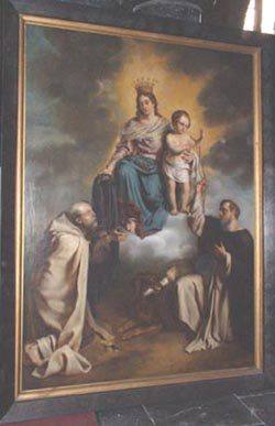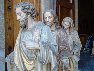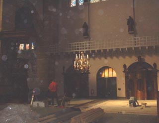 | -Rechtsboven: Impressie van het interieur waar bouwvakkers druk bezig zijn met de verwijdering van de kerkbanken de schilderijen en ander decor en het herinrichten van de kerk als nieuwe concertzaal en Jeroen Bosch documentatiecentrum. -Voorbeelden van kunstschatten uit de Jacobkerk die door de Parochie Binnenstad werden veilig gesteld. Boven een altaarstuk vermoedelijk uit de Waterstaatkerk [voorganger van de huidige kerk] of al uit de middel eeuwse St.Jacobkerk. -Rechts: Zelfs de heiligen lopen de kerk uit.. foto © paul kriele, 1 september 2004. |