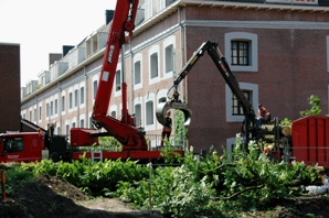 | De in stukken gehakte mootjes van de boom worden fagevoerd. | Zicht op de Mortelkazerne [* 1742] waar naast de boom al 140 jaar stond. |