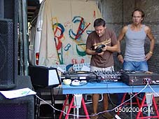 -Links boven: Een overzicht van de straatactiviteiten. -Rechts boven: Het Vicki Bronwhuis had een infomarkt ingericht over levensbedreigende ziekten [r]. -Links: de disk-jockey van ABCD-records en rechts Tangoles-op-straat. foto's © gerard monté, 5 september 2003. |