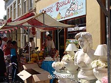 Op het binnenplein aan de Pijnappelsepoort was een rommelmarkt en vele winkeliers maakten van het straatfeest een braderie, zoals hier [r] de slager en de cadeaushop |