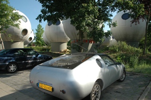 De door de architect zelf ontworpen ronde ! opbouw van een Simca Merena, die naar Belgisch plan zou worden uitgevoerd als elektroauto. Maar het gaat Kreijkamp, die zelf niet op de foto wil, meer om de aanblik van het kale bollenveld, waar geen tuintje meer als tuintje en geen perceel meer als erf herkenbaar is. |