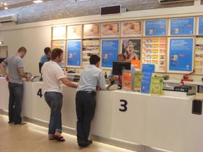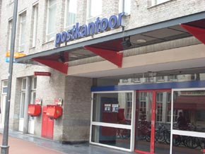| De 21 baliemedewerkers van de Postbank in de Kerkstraat hebben, door eerst automatisering en daarop digitalisering, en nu minder geldtransacties, minder werk te doen. | De gevel van het posrkantoor in de kerkstraat nog tot 1 oktober 2009. Dan gaan alle 250 postkantoren dicht. foto's © paul kriele, 29 juli 2008. |