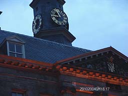 De klok van de stadhuistoren die stil staat. De foto is gemaakt om18.17 uur. Oorzaak: wintertijd.. of een te drukke week gehad? foto © gerard monté, 29 oktober 2004. |