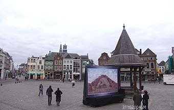 | Indruk van de opstelling van de kopie van het schilderij Schermersoproer op de Markt. Rechts: Rob van de Laar [rechts onder op de linker foto] heeft op de Markt zojuist -mede-het schilderij Schermersoproer geplaatst. |