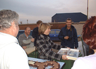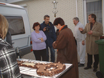 | Wehouder Elly de Jonge met Jet van Oorschot [rood vest] die deze week haar nieuwe woning betrok. iddenin, op de achtergrond met wit ovehemd, Henk Spijkers van Divers/Woonwagenzaken]. Boven: Rondom de oplevering werd hen symbolisch de eerste -chocolade - sleutel overhandigd. Rechts: Na de officiële overhandiging ontvingen ook de overige bewoners en de gasten een - kleinere - sleutel van chocolade. Tweede van links Johannes Zwakhoven, die ook al in een nieuw huis woont. |