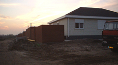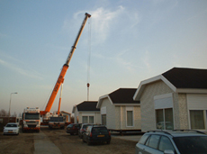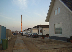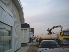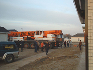 | L en r de Wolfsmelkstraat waar al circa 10 woningen zijn geplaatst. De wagens worden door kraanwagens met uiterste precisie op de hun plek getild. | foto's © paul kriele, 2 december 2004. |