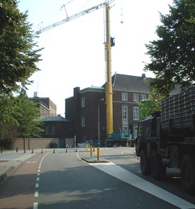 | Op de Spinhuiswal werden verkeerslichten geplaatst om de dagelijkse files van auto's over één rijbaan te kunnen geleiden. foto's © paul kriele, 30 juli 2004 |