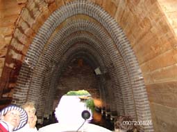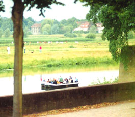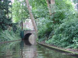 Deze editie- juli 2004- van de literaire vaartochten kende geen overweldigende belangstelling, maar was door de voordracht van vier bekende Bosschenaren wel erg gevarieerd. Rechts: de Bogen van de Kruisbroedershekel en de Casinotuin met de 'Brug der Zuchten', een naam afgeleid van de vrijende paartjes die dit als domein kozen. |