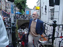 | Van Laarhoven signeert de daarvoor speciaal voor deze editie 'Woorden op Water' geproduceerde tekstboekjes, die pas na afloop van de tocht door Ruud Bokelo [foto rechts boven blauw overhemd] werden uitgedeeld.. | Van Laarhoven na de tocht. foto's © gerard monté, 9 juli 2004. |