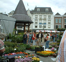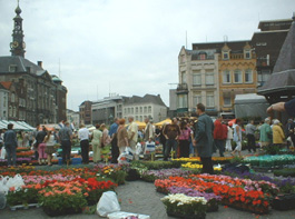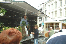 Mensen en bloemen zijn de vaste ingrediënten van een zonnige en druk bezochte geraniummarkt 2004, vanouds de bloemenmarkt op de Bossche Markt op Hemelvaartdag. foto's © paul kriele, 20 mei 2004. |