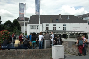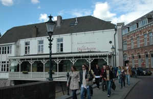 | De -van afkomst - gemêleerde groep eerste jaars HAS-studenten arriveert bij de opstapplaats bij De Grote Hekel. | De brug over de Binnedieze nabij café/restaurant Het Diezehuys. foto's © paul kriele, 31 augustus 2010. |