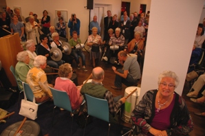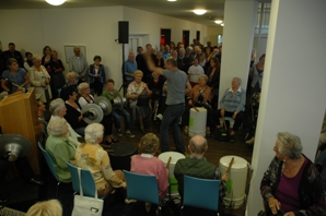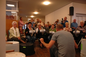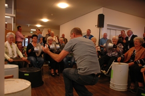 In Oosterhof aan de Eemweg is vanmiddag 20 september 2010 de feestweek rond het 40-jarig bestaan en rond de afronding van de verbouwing van de begane grond* geopend. Dat gebeurde met toespraken en het doorknippen van een lint. Maar daaraan vooraf speelden een vijftiental bewoners en bewoonsters olv de auditief- kunstenaar Bart van Dongen als huisorkest met behulp van attributen uit de voorbije verbouwing een niet onverdienstelijk stuk muziek.