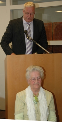 | Bovenin: Het doorknippen van het lint als teken van de opening van de feestweek door wethouder Van Bussel, die zich liet assisteren door mevrouw Van de Loo van Papenhulst en de heer Brands van Citadel. | Links en hierboven: de heren Harco de Bruin, hoofd kennis-en behandelcentrum en locatiedirecteur Jos Ernst. foto's © paul kriele, 20 september 2010. |
