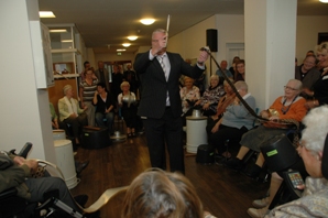 Na die act met Bart van Dongen, die alle aanwezigen bewoners en bewoonsters en functionarissen erg aansprak, volgde het officiële gedeelte: de toespraken en het doorknippen van een goudgekleurd lint. Dat deed wethouder Toon van Bussel van o.a. Zorg en de locatiedirecteur Jos Ernst en het hoofd kennis en behandelcentrum Harco de Bruin.