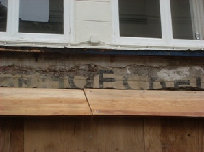 | Prenatal aan de Schapenmarkt heeft ook etalages aan Achter het Stadhuis 15. Daar zijn boven de winkelepui de letters Van Hoeckel tevoorschijn gekomen. | Vlnr: VAN HOECKEL staat er eels en vaag te lezen. foto's © paul kriele, 27 september 2010. |