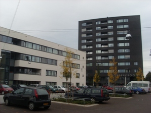 Het Woonzorgcentrum Noorderkroon nabij de Ploossche Hof. Hieronder de maquette van het station van Cuijpers anno 1896, gemaakt door Jules Vismale. Het station, dat op 27 oktober 1944 door fosforgranaten werd getroffen, bleef als een ruïnie nog tot 1950 overeind staan. foto's © paul kriele, 4 oktober 2010. |