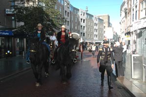 | De stoet gaat door het Geertruikerkhof waar .. | .. ook een oude postbus en een nieuwe Arriva- bus passeerde. |