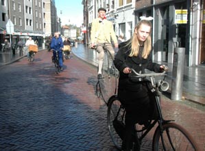 | De kop van de optocht met een agent voorop. | Boven en onder de Fietsgroep Noord [Groningen, Friesland en Drenthe] was er met een grote deputatie fietsende fietsers. |
