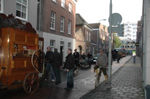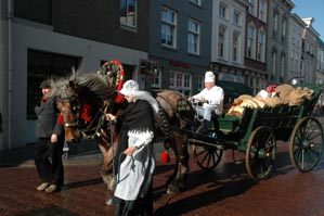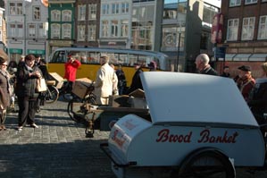 | Een boerenkar met meelzakken en brood en een paar kindjes. | De stoet is aangkomen op de Markt. De bakkersbakfiets uit de jaren 40-50-60. |