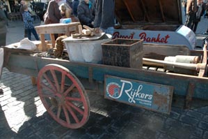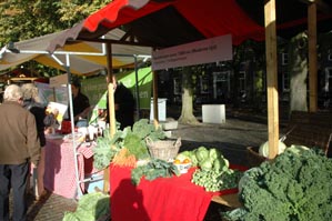 | De kramen van Coocking Adventure die ook workshops geeft. | Op dit bord staat dat het een marktkraam is anno 1900, maar nu in de moderne tijd geplaatst. foto's © paul kriele, 23 oktober 2010. |