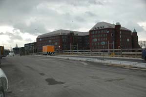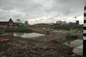 | Bovenop het viaduct naar de Magistratenlaan, zoals hierboven vermeld, met links het Paleiskwartier. | Hetzelfde viaduct met rechts Essent. foto's © paul kriele, 8 november 2010. |
