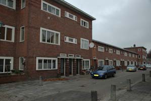 | De Geert van Woustraat waarvan het laatste deel in deze gevelrij wordt gerenoveerd. foto © paul kriele, 8 november 2010. |