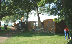 | Aannemers P. Lock c.v. en Meerkerk Houtbouw zijn bezig een keet op te zetten op de Noord-Westelijke zijde van Bastion Oranje. | foto's © paul kriele, 31 mei 2005. |