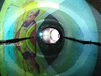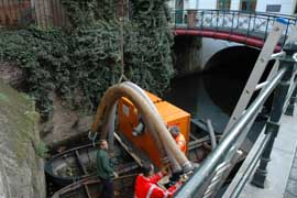 Actie van het Genootschap naamsgebruik 's-Hertogenbosch in de Binnendieze. Op de foto Sjef Brummer. foto © gerard monté, 6 juli 2005. |