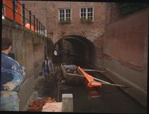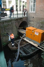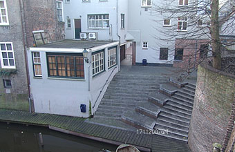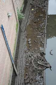 | Schoonmaakactie ter hoogte van het dubbelpand De Klomp tegenover de Mariënburg. Rechts bovens: foto vanaf het bruggetje ter hoogte van het Lamstraatje richting opstapplaats Diezevaarten. Rechts zicht op het voorpand van het Huis van Boxtel [voormalige schuilkerk] ter hoogte van de jeux de boulesbaan. De foto is genomen vanaf de steiger bij Jeux de boulesbaan richting Mariënburg/Vughterstraat. foto's © paul kriele, 10 november 2005. |