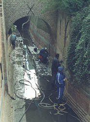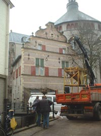 | Boven: detail van huize De Klomp met de kades van de Binnendieze. Rechtsboven: Vanaf het bruggetje in het Uilenburgstraatje heeft men een mooi zicht op het pand Molenstraat 18, het meest gefotografeerde pand van 's-Hertogenbosch, maar dat ligt er nu wat kaal bij. Rechts: twee werklieden herstellen het metselwerk onder restaurant Van Puffelen in de Molenstraat. foto's © paul kriele, 1 december 2004. |