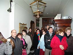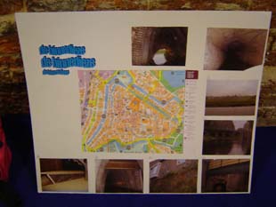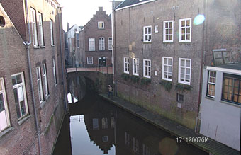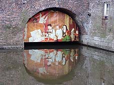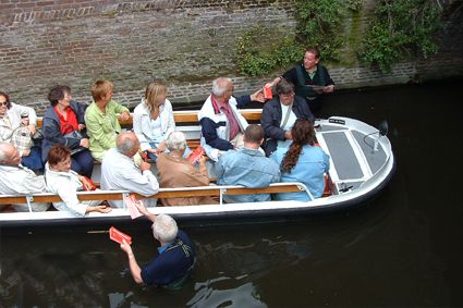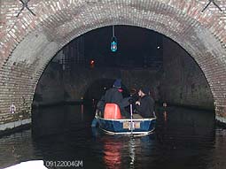 | Rechts boven: Een tussenstop in het Zwanenbroedershuis. De route gaat bij de Grote Hekel eerst even buitengaats langs de met een kort stukje langs de stadsgracht. Boven: korte rondleiding in Zwanenbroedershuis. Rechts: Op deze foto bevindt de boot zich op het traject tussen de Geerlingse brug en het Oeteldonks Gemintemuzejum. foto's © gerard monté, 12 december 2004. |