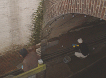 | Detail van 'de Verloren zoon' of zwerver.. | Een boogdoek in de Noordelijke toren van de Waterpoort bij de Knillispoort. foto's © gerard monté, 15 mei 2005. |