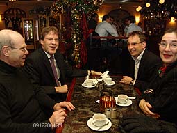 | Hotel Central voor koffie glkuhwein en warme strudel. Vlnr.John Vermulst van De Groote Stroom, René van Holsteijn, directeur Weenergroep, wethouder Bart Eigeman en Karin Rademaker van Golden Tulip Hotel Central. |