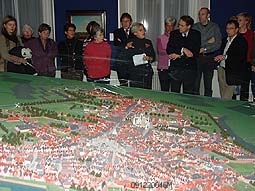 | Ontvangst in het Noordbrabants Museum met welkomstlied van de Fermaatjes olv Marion Zwanenberg. Rechts: Annelies Klaphek [NbM] geeft bij de stadsmaquette van 1794 [Franse tijd] een utleg over de toenmalige positie van 's-Hertogenbosch. Rechts: De groep wordt begeleid en geïnformeerd door de gids John Vermulst. foto's © gerard monté, 12 december 2004. |
