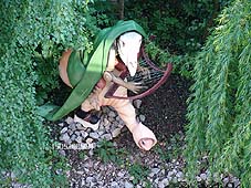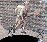 De route begint bij restaurant De Roode Leeuw/Jill's. Nabij de Geerlingse Brug verschijnt dit beeld. - foto's © gerard monté, 12 december 2004. Boven: Het omstreden figuurtje: een harpspelerzit op een kip met lange nek en monnikspak op. foto's © gerard monté, 15 mei 2005. |
