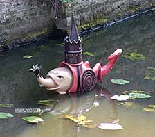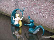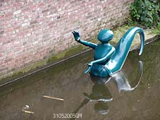 Boven: de harpspeler iets vergroot. Links het beeldje is afgeleid van een ware figuur in Tuin der Lusten van Jeroen Bosch Rechtsboven: Een vis met torentje op zijn rug en rechts met een zeilboort. ter hoogte van de Louwsche Poort. Rechts:een zeemeermin en een duivels figuurtje bij 'In de Boerenmouw'.. foto's © gerard monté, 15 mei 2005. |