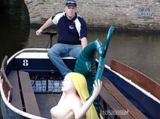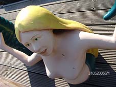 | Het duivels figuurtje bij 'In de Boerenmouw', dat de zeemeermin bedreigde. In deze situatie is de zeemeermin nog net ontsnapt aan de duivel. Rechts bocen: schipper JP redt de zeemeermin en brengt haar naar veiliger oorden. Vanuit de boot kan zij op de kade worden gehesen. Rechts: de zeemeermin bevindt zich in een veilige oositie op de steiger van de Groote Stroom. foto's © gerard monté, 31 mei 2005. |