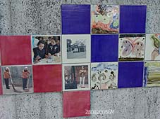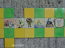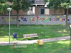 | Tekeningen van kinderen en ook foto's van bekende personen en dieren uit de wijk tooien de grauwe muur. - |
