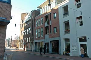 | Het rijtje op Visstraat noordzijde, waar midden in de gevelrij het pand, nummer 51, leeg staat. Daar wil Albert Heijn met een AH to go starten. foto © paul kriele, 13 februari 2008. |