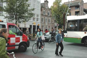 Vrijdagmorgen 21 september 2007, rond 12 uur was het een drukte van jewelste op de Visstraat ter hoogte van Den Otter: geparkeerde auto's, overstekende voetgangers, kruisende bussen en busjes en vrachtwagens. Daar tussendoor laveren de fietsers. Op de achtergrond -foto rechts- zijn de lichte natuurstenen blokken te zien die de snelle jongens in opgevoerde auto's moeten weren.