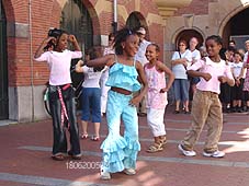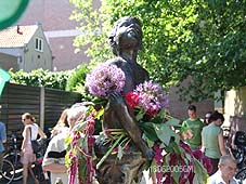 | -Boven: Accordeonvereniging Blij Leven op het Herman Moerkerkpleintje nabij Dieske dat vanwege de Sint Jansdag in de bloemen was gezet. -Rechts: Het Kerkplein werd de hele zomerse zaterdag in juni dag afwisselend bezet door koren en andere muziekgroepen. foto's © gerard monté, 18 juni 2005. |