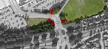 | Komend vanaf de Aartshertogenlaan of de Graafsweg was de eerste confrontatie met De Vliert de betontrappen. Vooraan -van links naar rechts -de Aartshertogenlaan naar Hintham en onderaan het kruispunt met de Graafseweg. foto © BAI, 2011. |