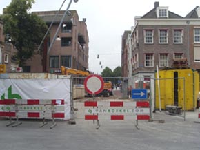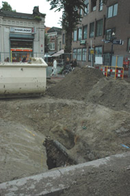 | De Visstraat ligt overhoop. Voordat een nieuwe rioolbuis kan worden gelegd moeten eerst allerlei leidingen worden verplaatst. Op de voorgrond de Diezeoverkluizing die meteen wordt gerestaureerd. |