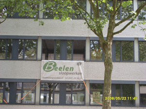 | Containers van Beelen staan langs de Zuidwal geparkeerd om de sloopproducten te gaan opvangen. - foto's © paul kriele, 5 mei 2008. | Op het gebouw Zuidwal hangt een groot bord met Van Beelen sloopwerken. |