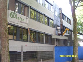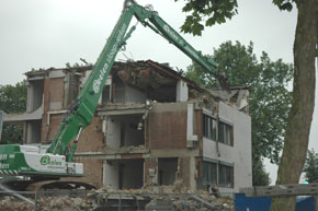 Start sloop kantoorpand Beurdsestraat /Hoek Zuidwal. Maandag 28 april 2008 begon -na allerlei vorbereidingen zoals het uitruimen en de bomenkap- dan echt het eerste werk van de sloop Voertuigen werden naar de bovenste verdieping gehesen, waar ze met de sloop kunnen beginnen.
