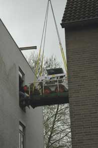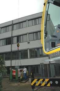 | Bobcat, heet de kleine dragline. Deze 'schranklader' ging van de binnenplaats in de takels van takelbedrijf Saan. | Het werktuig, dat de sloper Van Reenen gebruikt, ging naar de tweede verdieping om daar ingereden te worden. foto's © paul kriele, 28 april 2008. |