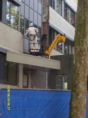 | In witte pakken gestoken mannen zijn bezig eerst het asbest aan de gevels te verwijderen | foto's © paul kriele, 30 juni 2008. |