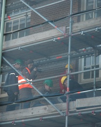 | Achter het bouwgaas speelt zich op de eerste etage van de Willen II-fabriek het moment af dat symbolisch de start aangeeft van de restauratie van dit kunstencluster in de Boschdijkstraat. Gedeputeerde [voor o.a. monumenten] Birgitte van Haaften en cultuurwethouder Rodney Weterings zetten een ruitje in. |